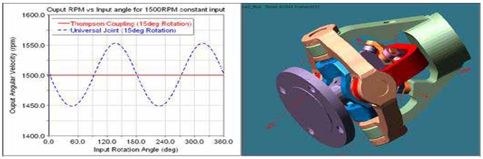 The graph above illustrates the difference in output motion of a universal joint (non-constant velocity) and a Thompson Coupling showing true constant velocity. The resultant non-constant velocity motion in traditional couplings produces shaft vibration and additional driveline forces causing increased wear and reliability issues for the power system.